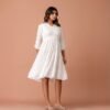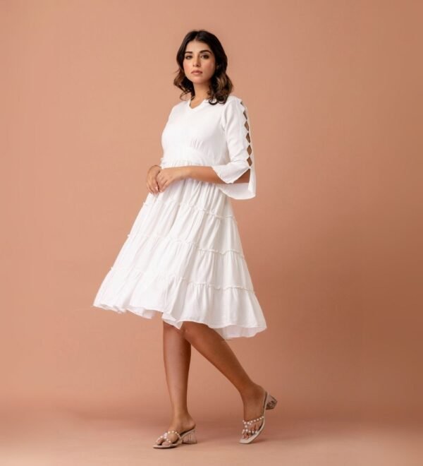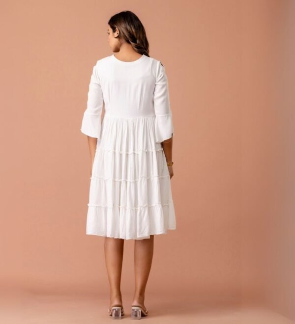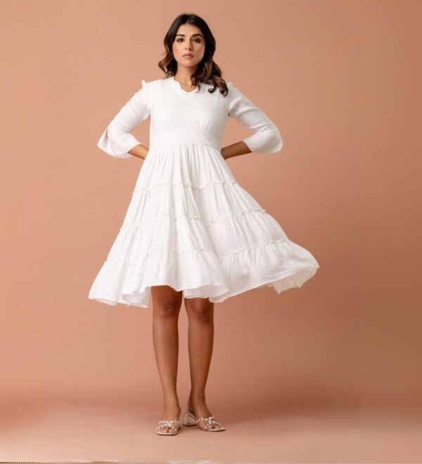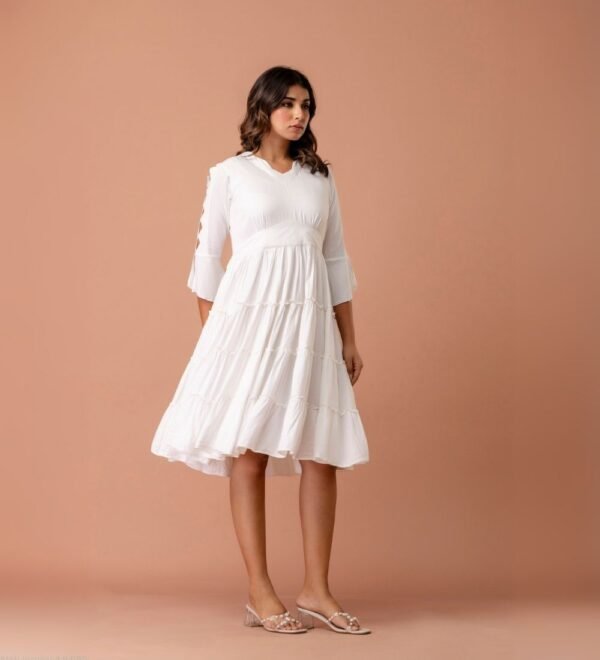 Tailored to flatter with a gently flared hem, clean neckline, and minimal detailing, it brings harmony to modern silhouettes while staying rooted in softness.All-White Elegance: