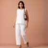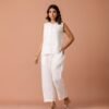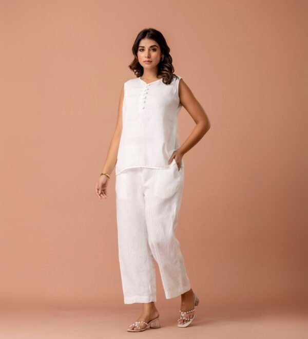The top features a structured-yet-relaxed cut with soft lines, while the matching pants offer a refined, clean silhouette—making it perfect for day events, minimalist celebrations, or elevated everyday dressing.