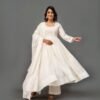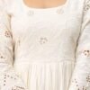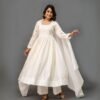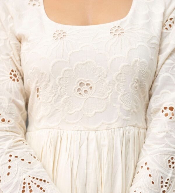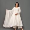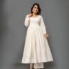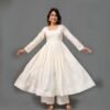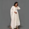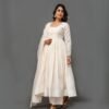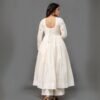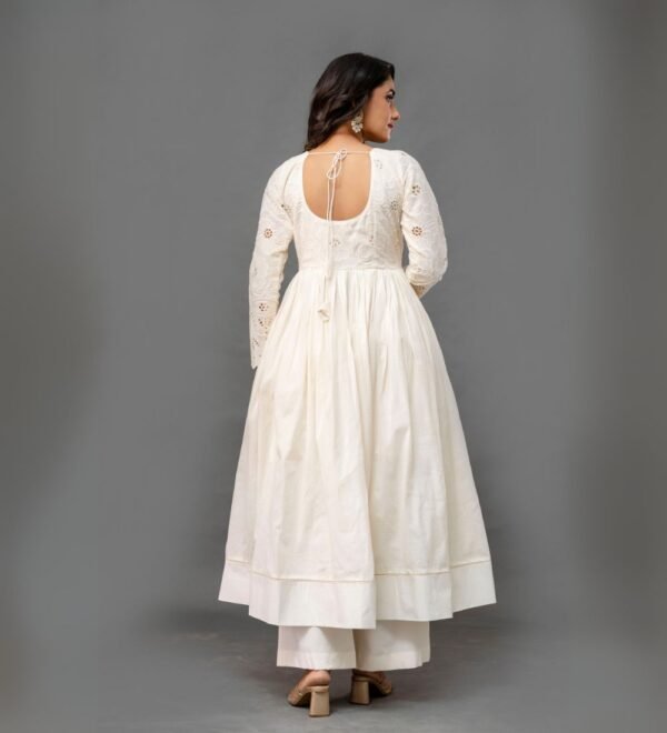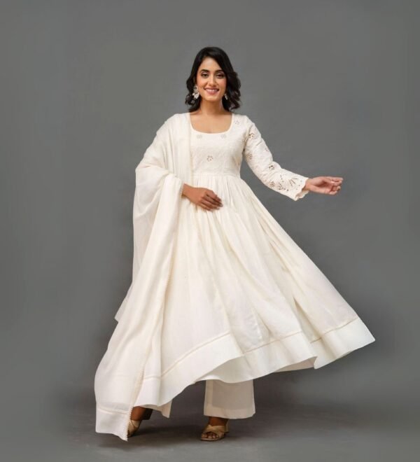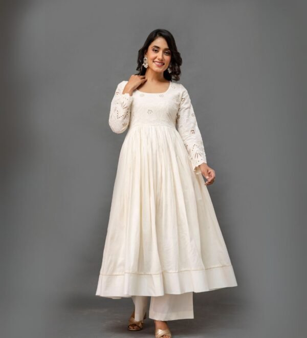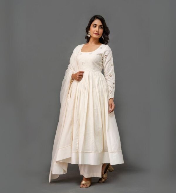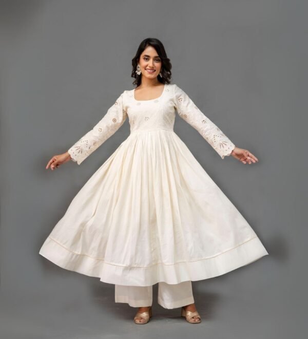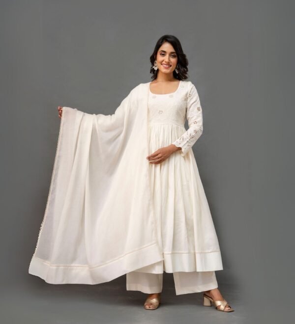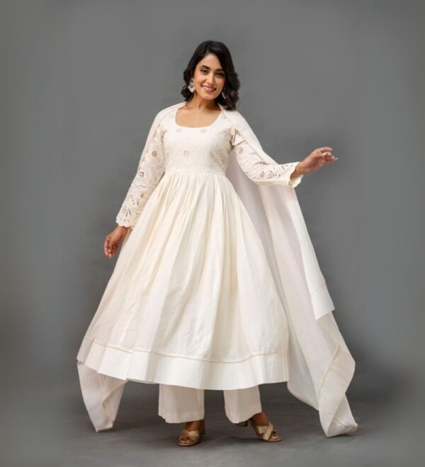 Step into timeless elegance with this Ivory Anarkali Kurta Set, a perfect blend of grace and tradition. Crafted in soft, breathable cotton fabric, the ensemble features: A flared Anarkali kurta with delicate floral embroidery on the yoke and sleeves, adding a subtle charm. Intricate cutwork detailing on the sleeves, enhancing its ethnic appeal. A pair of comfortable straight palazzo pants for effortless style and movement. A matching lightweight dupatta with minimal lace edging for a graceful finish. This ensemble is ideal for festive gatherings, intimate celebrations, or day-time functions, offering both comfort and sophistication.