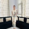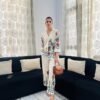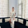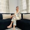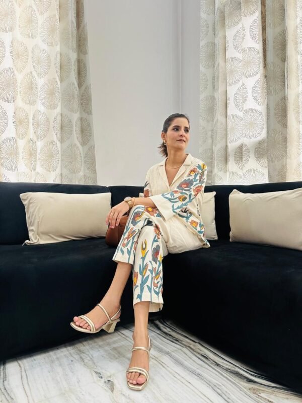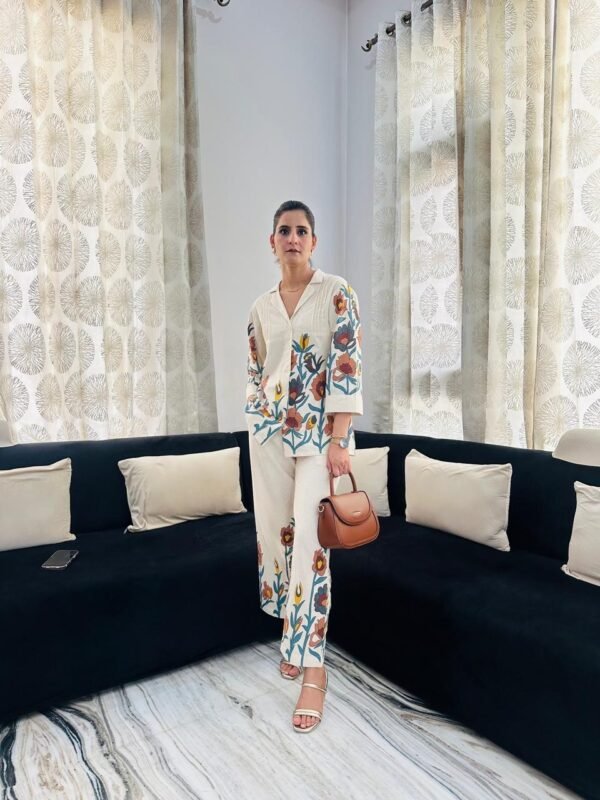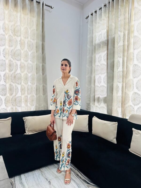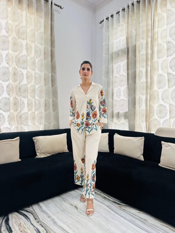 Crafted in soft, breathable cotton flex fabric, this outfit features a unique floral print on both the shirt-style top and relaxed-fit trousers. The neutral off-white base enhances the multi-color floral design, giving it a vibrant yet sophisticated appeal.